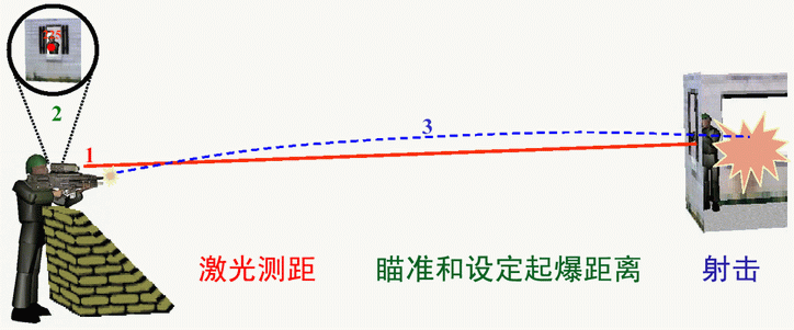 “窗式模式”的范例:①测量距窗户的距离;②把引爆距离增加1、2米,瞄准点对准窗户;③榴弹通过窗户射入室内1、2米后爆炸,杀伤室内目标。
