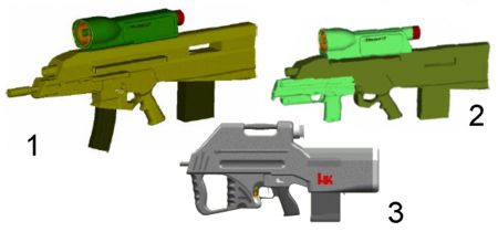 HK公司设想的HE模块使用方式:1为OICW原样,2为把KE模块换成HK PDW(MP7),3为单独使用HE部分。