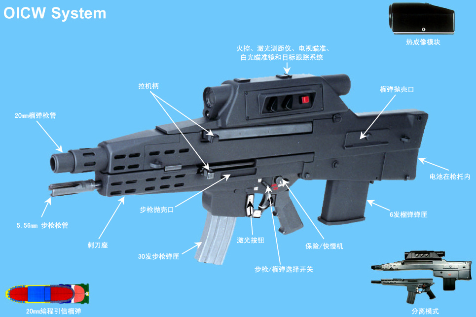 OICW主要由动能武器(5.56mm突击步枪模块)、高爆弹武器(20mm半自动榴弹发射器模块)和带有火控系统的瞄准装置及握把组成,而动能武器与高爆弹武器可以分开来独立使用。各个模块之间的数据传输是取自宇航技术中的小插头,在组装武器时自动连在一起。