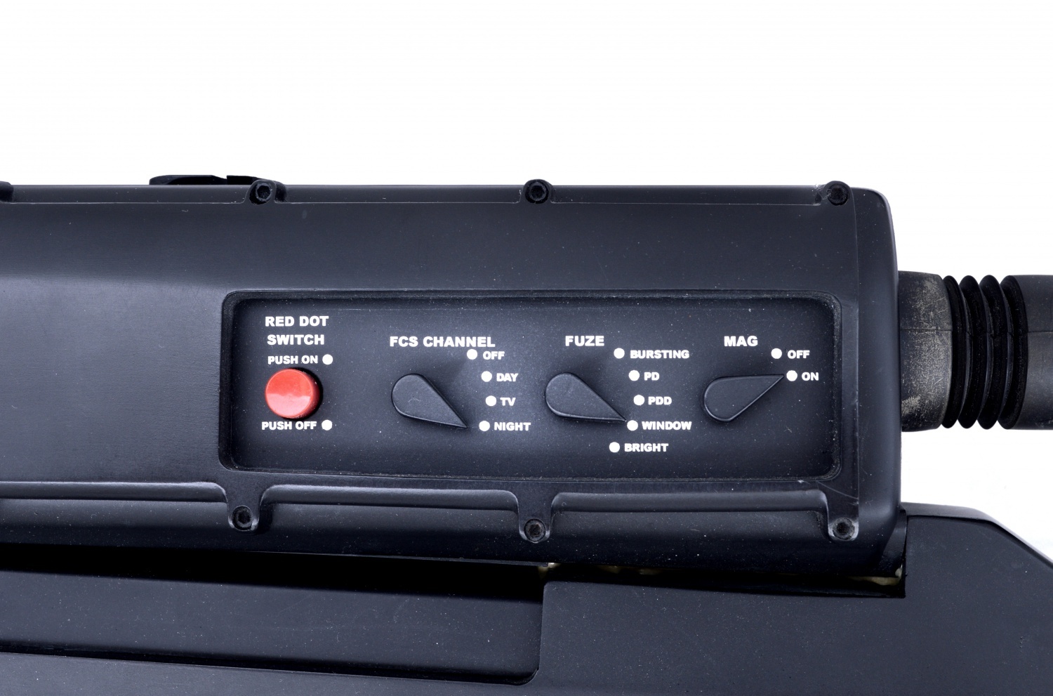 和动能武器模块一样,高爆弹武器模块也可以两边操作。两个抛壳口中不使用的一个有防尘盖,因为高爆弹武器模块采用无托结构,如果没有这个防尘盖,发射时的火药燃气会喷到射手脸上。枪托尾部有美军使用的标准6V充电式锂电池,作为光电瞄具及火控系统的能源。只要打开枪托底板就可以更换电池。