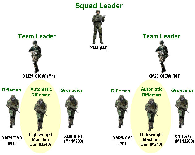 武器分配:班长XM8,组长XM29,步枪手XM29或XM8,榴弹手XM8挂榴弹发射器,轻机枪手M249