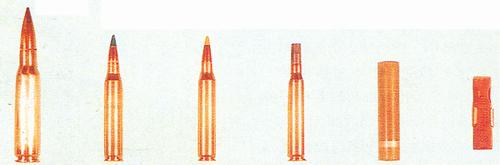 从左到右:7.62mm NATO弹,5.56mm NATO弹,柯尔特双头弹,AAI箭弹,斯太尔箭弹,HK无壳弹