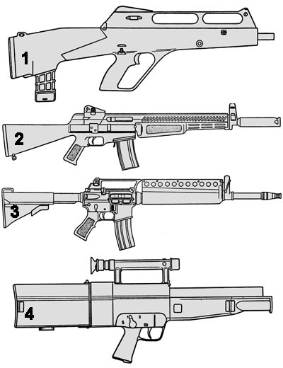 从上到下分别为:斯太尔(Steyr)ACR;2-AAI ACR;3-柯尔特(Colt)ACR;4-H&K ACR