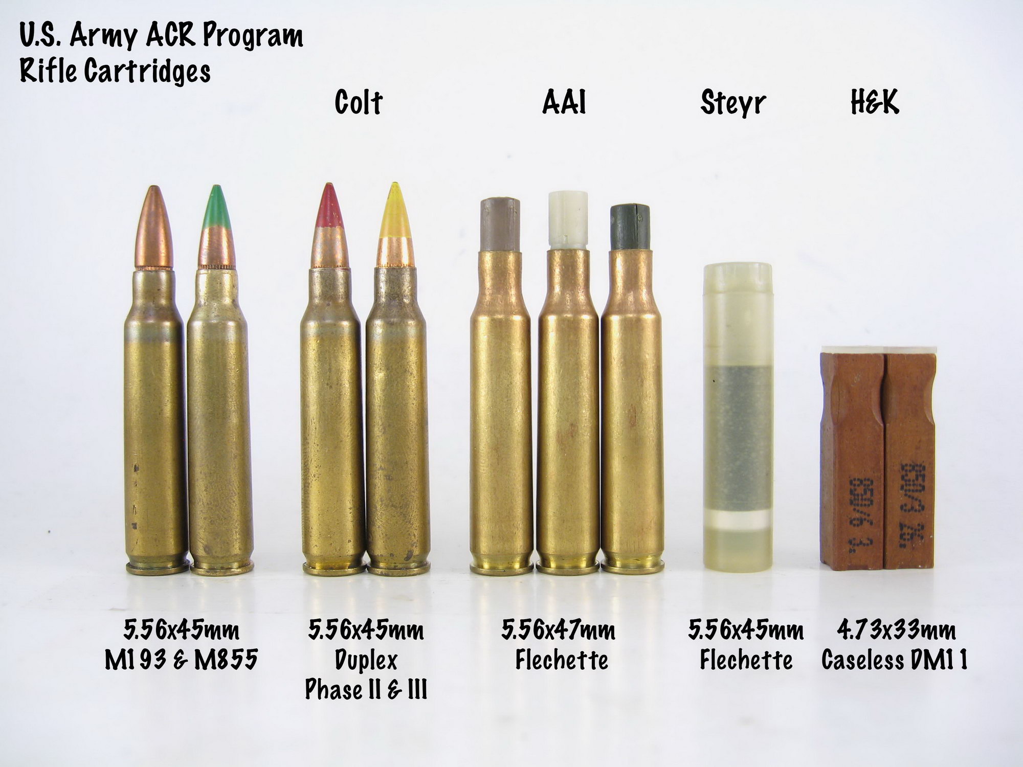 从左到右:5.56mm NATO弹,柯尔特双头弹,AAI箭弹,斯太尔箭弹,HK无壳弹