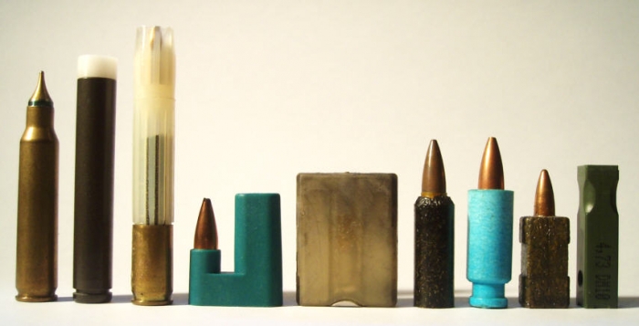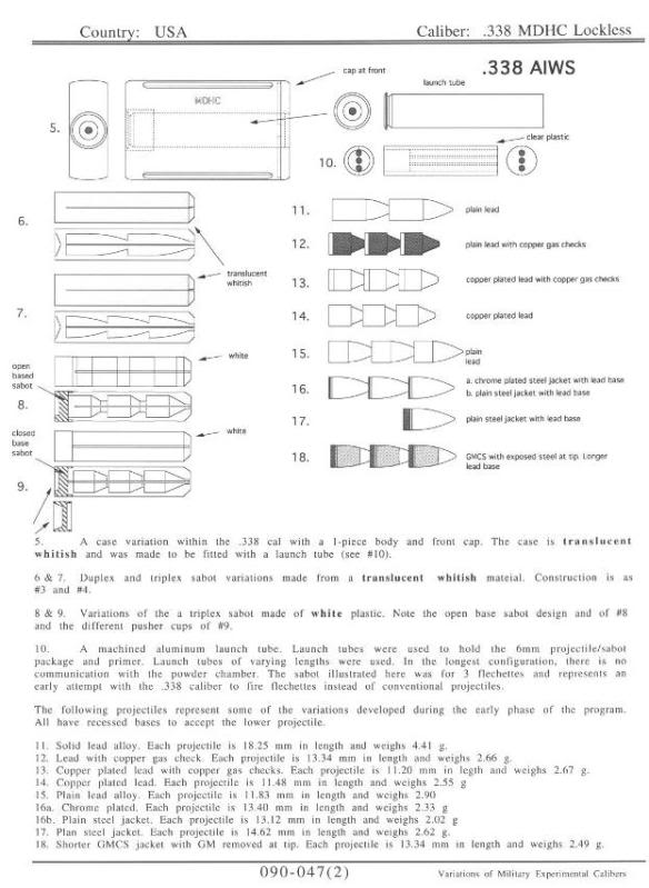 麦道公司研制的双头弹结构的5.56mm非闭锁弹(最中间的方块)与其他1970~80年代的各种试验型弹药