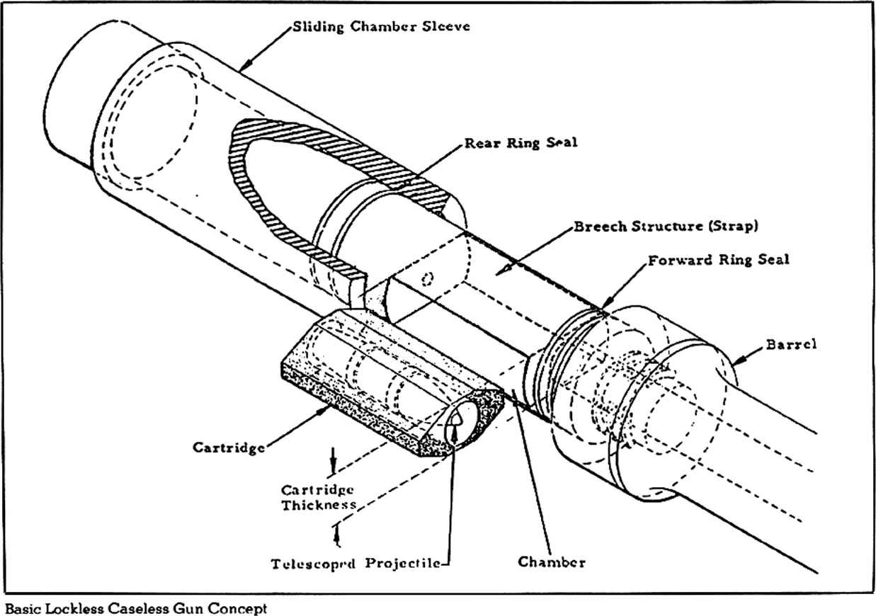 LRMG在结构上的新颖之处是采用没有弹膛、枪机不闭锁的滑动套筒式自动机,这种系统采用重量较轻、结构较为紧凑的塑料弹壳枪弹,能大幅度减轻武器的系统总 重量。所配的“非闭锁弹”采用塑料制的长方体弹壳,弹头完全嵌入弹壳中央(属于埋头弹的一类),药室位于弹头两侧。由于其形状就像方块形的巧克力,所以也被美国人戏称为“方块弹”。由于采用埋头弹结构,因此尺寸紧凑,而且因为使用塑料弹壳,所以全弹重量很轻。以安装一枚M193弹头的5.56mm非闭锁弹为例,其全重为4.35克,而一枚普通的M193弹全重为11.79克。