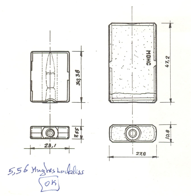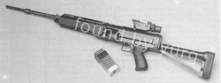 休斯公司早期研制的5.56mm非闭锁弹及其步枪和轻机枪,弹壳内装有一枚M193弹头,因此弹的尺寸非常小,所以弹匣也窄得像冲锋枪弹匣一样