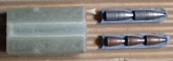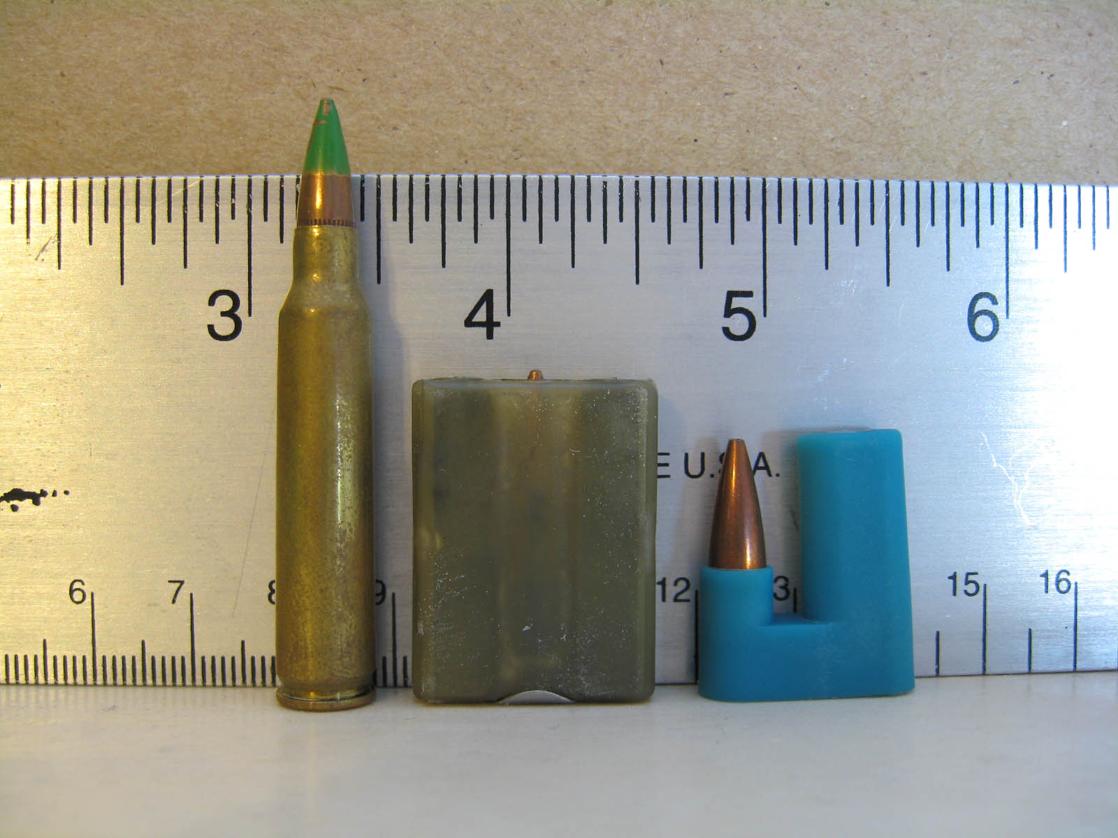 左边是5.56mm M855弹,中间则是5.56mm休斯非闭锁双头弹,因为是串联式的双头弹,所以右边是长度一样短的5.56mm折叠弹