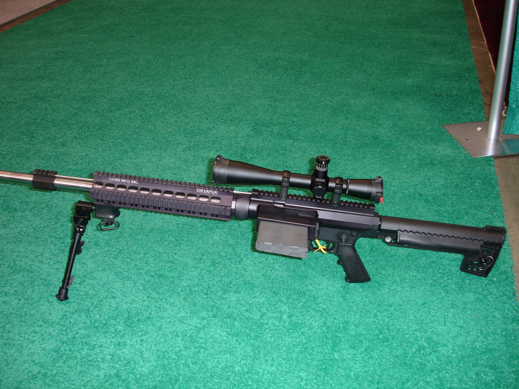 Cobb MCR400 .338拉普口径步枪,此枪的下机匣为5.56mm式弹匣座,如果采用左侧供弹就不需要对下机匣“动手术”。
