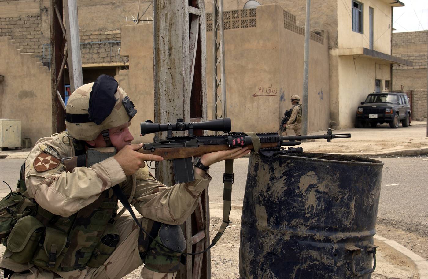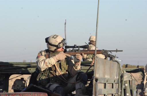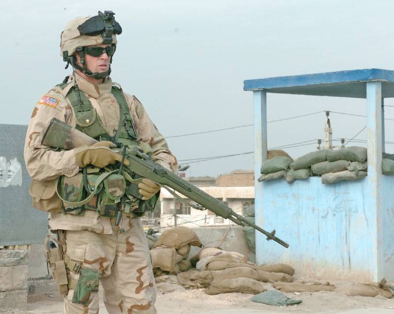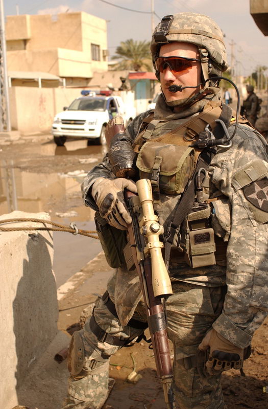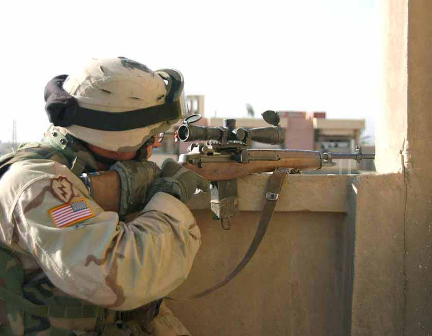 伊拉克战争中使用M14用作精确射击支援的美国陆军特种部队士兵,注意机匣上也是安装了快慢机锁