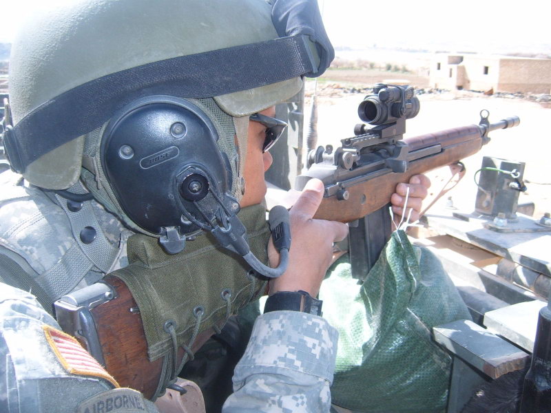 在阿富汗“持久自由行动”中的美国陆军第82空降师士兵使用配有ACOG瞄准镜的M14,步枪安装了快慢机锁,因此只能单发射击