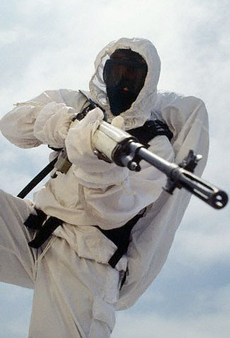 这张照片只是做SHOW而矣,但服装与武器的搭配是在暗示射程远的M14比M4更适合在沙漠和雪原上使用。