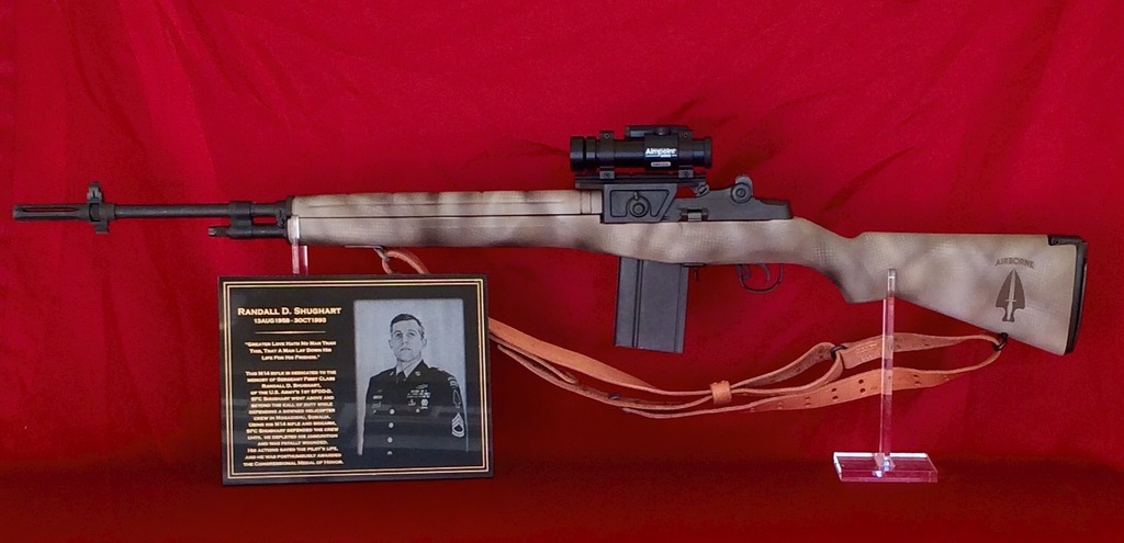 纪念1993年在索马里阵亡的兰德尔·舒加特(Randy Shughart)的博物馆中存放的M14,是仿照当时的配置制作的展品,枪上也安装了一个AIMPOINT 5000红点镜,但缺少了另一个附件:AIM-1红外激光指示器