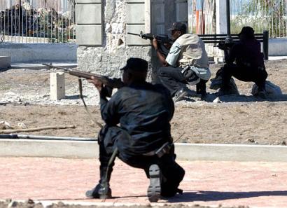 ![]() 2004年7月27日,美国陆军第294步兵旅第1营正在吉布提与当地国民警卫队一起进行军事演习,模拟转移伤员。 |