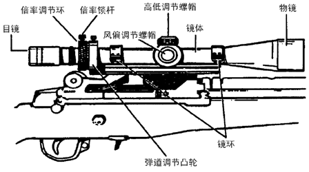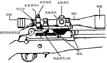 由此可使狙击手准确判定目标的距离。此外,ART瞄准镜还有另外一个作用——能自动地给出步枪准确的射角。该瞄准镜放大倍率环圈上有一弹道调整凸轮,它依据所使用的枪弹的种类进行装定。当把准距线调到上述正确的位置后,不仅可读出目标的距离,而且可以根据瞄准镜轴线的移动来给出步枪的射角。其做法是,先确定出弹道调整凸轮——通常用M118比赛弹作标准——在瞄准镜架的凸轮座上的位置,并用瞄准镜架中的弹簧定位。这样,不管放大倍率环圈(弹道调整凸轮即装在上面)如何调整,只要两准距线之间的目标的高度是0.76米,就可以读出准确的距离。