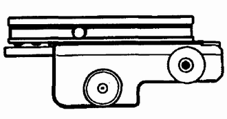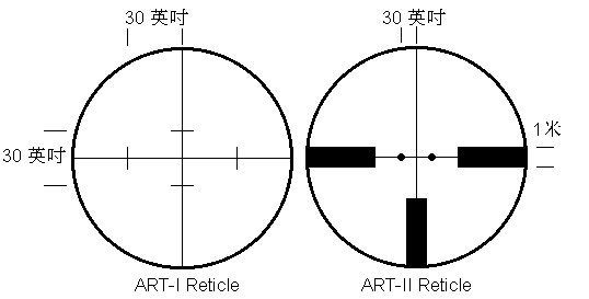 ART瞄准镜的特点是在十字分划的横标线和竖标线上各有两个准距线。当放大倍率为3时,横标线的两个准距线对应于300码(约274米)处的实际长度是60英寸(1.52米),而竖标线的两个准距线则对应30英寸(0.76米)。如下图所示,普通士兵的腰带到钢盔顶部的长度是0.76米,故在300码的距离上,瞄准镜放大倍率装定为3时,竖标线的两个准距线刚好分别碰到瞄准镜中人像上的腰带和钢盔顶。若目标在300码以外,可调整放大倍率环圈,使准距线再次落到腰带和钢盔顶上。距离与放大倍率是成正比的,例如,距离为300码时,使用3倍放大率就刚好使准距线落在腰带和钢盔顶上,那么在放大率为9的情况下,准距线落在这两个位置时所对应的距离就一定是900码。