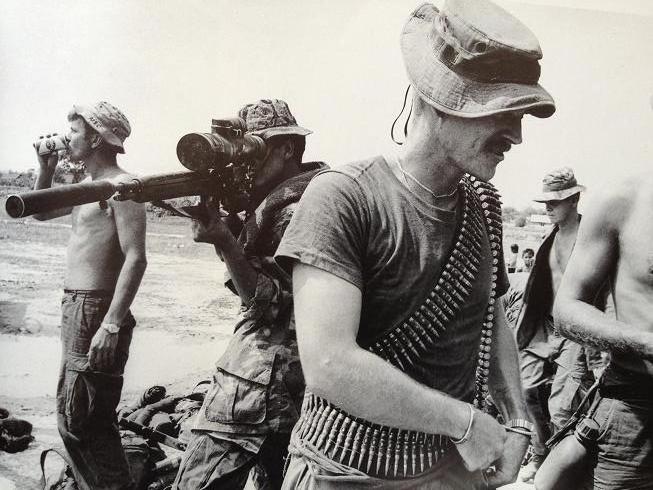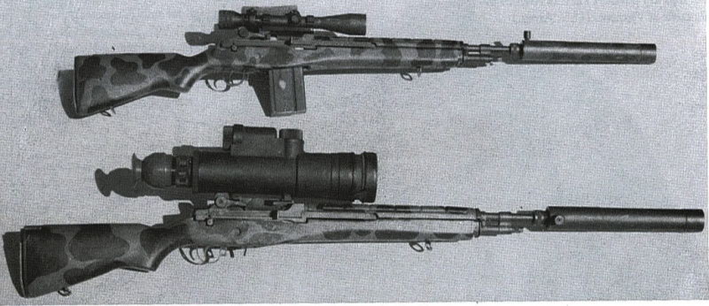1969年,美国陆军第25步兵师在越南的一个狙击小组,这两把XM21上都安装了Sionics SS-1消声器和ANPVS-2夜视瞄准镜。