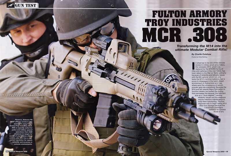 M14 MCS模块式底座系统(Modular Chassis System)是特洛伊公司新推出的M14模块化枪托,它的核心部分是一个整合了导轨的铝合金制上、下前托,称为底座,可由用户自己不需要改进就能很容易地换上各种AR式的各种枪托和握把。而由富尔顿工厂(Fulton Armory)推出的安装MCS枪托的整枪则称为MCR模块式战斗步枪(Modular Combat Rifle),在特洛伊公司的产品列表上,MCR取代了原来的SOPMOD M14。在2011年的新简介上,MCR又改名叫M14 S.A.S.S.。