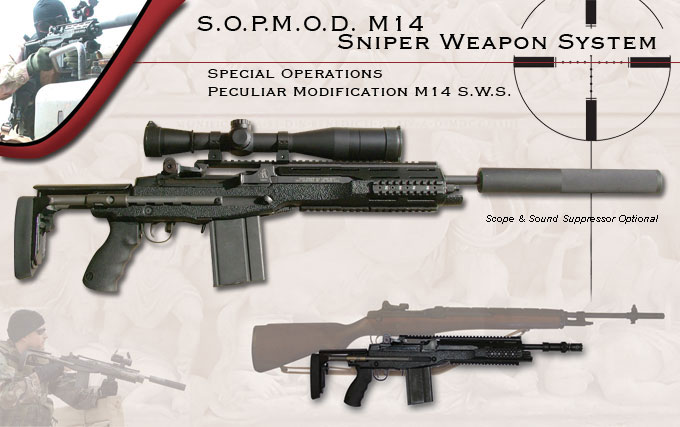 SOPMOD M14的原型是由洛克枪管公司(Rock Creek Barrels, Inc.)设计的Mk14 MOD0原型枪,但由特洛伊公司生产,因此有人称这种枪为Troy SOPMOD M14或ROCK SOPMOD M14。该枪是使用“94禁令前”的M14步枪改装的,具有全自动发射功能,枪管采用是1/11.27的5R级的不锈钢比赛型枪管,并根据战术需要可在12英寸(305mm)、14英寸(356mm), 16英寸(406mm)或18英寸(457mm)这4种长度的枪管内更换,在使用16英寸枪管时,发射M118的初速达到2400FPS。