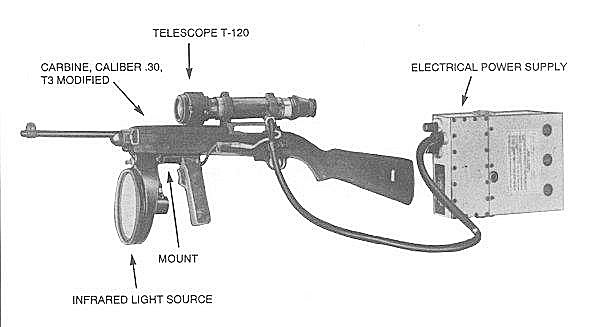 M3卡宾枪在研制时被称为T3式或T120式卡宾枪,是在1944年初应美国陆军的要求而开发的一种夜间近战用狙击步枪。T3卡宾枪基本上就是在M2卡宾枪的机匣上安装了一组主动红外夜视瞄准装置(命名为M1式狙击镜,也称为“Snooperscope”),前护木下安装了一个带控制开关的握把。由于主要是在夜间使用,在枪口上配有喇叭形的T27式高效消焰器,该消焰器最初是为M1伽兰德步枪研制的,后重新命名为M3式消焰器。减少射击时对夜视镜的影响,另外又取消了连发射击功能。T3卡宾枪在1945年8月才正式命名为M3卡宾枪,只生产了约2100支,主要用在朝鲜战场上。不过根据《国家记忆》中的附图显示,在1945年2月6日,美国起码在缅甸南坎试用过T3。