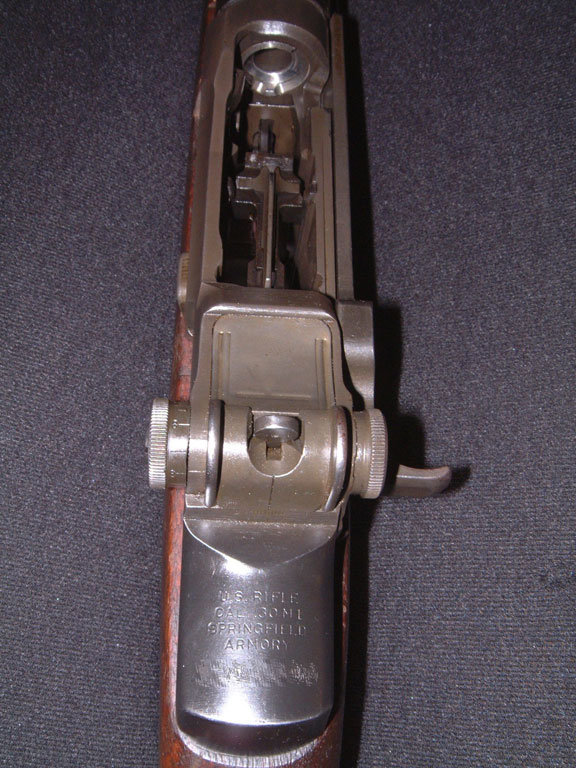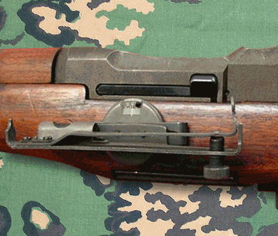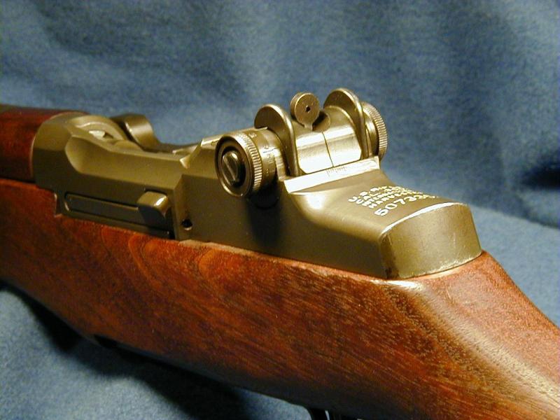 M1步枪的准星设在枪口导气箍上,片状准星,有护翼保护。觇孔式照门安装在机匣后上方,表尺分划为英制单位,从200码~1000码(约183m~914m),每100码为一个增量。枪口的前护手部分可作为刺刀座。