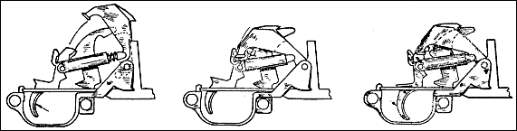 击发和发射机构动作:(a)扣压扳机,扳机连杆向前,解脱击锤;(b)枪机后座,压倒击锤,第二阻铁与击锤上的辅钩扣合,(c)松开扳