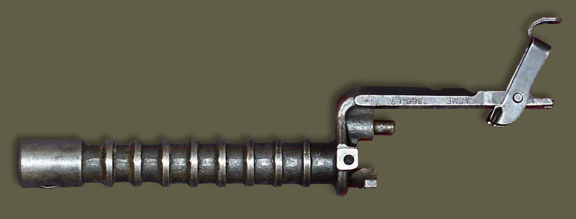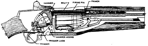 该枪的扳机上有扳机连杆和钩状第一阻铁。扣压扳机时,第一阻铁随之向前运动,带有阻铁簧的第二阻铁则装在扳机连杆上。击锤上有两个钩,当击锤被完全压倒时,两钩呈水平位置,但一个朝前称为主钩,一个朝后称为辅钩。