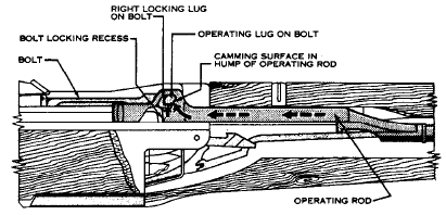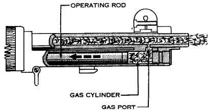 最初的M1步枪导气装置是从一个枪口套式的装置提供的,但这种设计并不可靠,于是从1939年后的M1步枪取消原来的枪口罩,改为在枪管下方靠近枪口的位置上设一个导气孔。发射时部分火药燃气通过该导气孔进入位于枪管下方的导气室内,并推动一个长行程导气活塞,活塞向后运动并通过连杆推动机框,机框经过8mm的自由行程后,枪机上的导向凸轮沿机框导槽的直槽部分滑动。在机框继续后坐时迫使导向凸轮向上,带动枪机由右向左转动,使枪机上的两个闭锁突笋从机匣的闭锁槽中解脱出来,实现开锁。枪机后坐过程中,拉壳钩、抛壳挺完成抛壳动作。与此同时,枪机后端压倒击锤,击锤簧被压缩,击锤成待击状态。当机框尾端撞击机匣后端面后,复进簧开始驱使枪机组前进。当枪机复进到接近闭锁位置时,机框导槽导引枪机上的导向凸轮向下转动,带动枪机由左向右转动,直至两个闭锁突笋进入闭锁位置。此后机框继续复进8mm自由行程,枪再成待击状态。