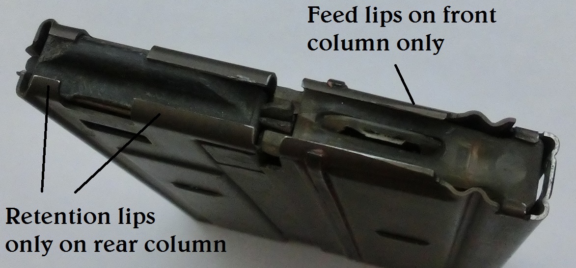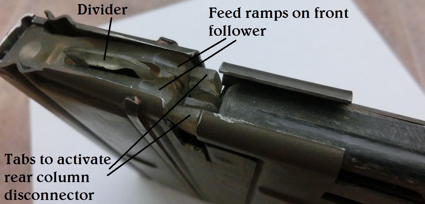 在射击时,往复运动的枪机先是使用前面的弹匣供弹,后面弹匣的枪弹会通过一个装置往下压低一些,这样虽然枪机后坐时是一直运动到两个弹匣的后面,但复进时却不会推后面的弹匣供弹。直到前面的弹匣打空时,就会有一个类似于空仓挂机的装置释放了后面弹匣里的枪弹,使其上升到枪机运动的路线上。不过后面的弹匣口部没有设计供弹斜坡,因此复进的枪机会把顶部的枪弹从后面的弹匣一直顶到前面的空弹匣的托弹板上,再接着推进弹膛里。