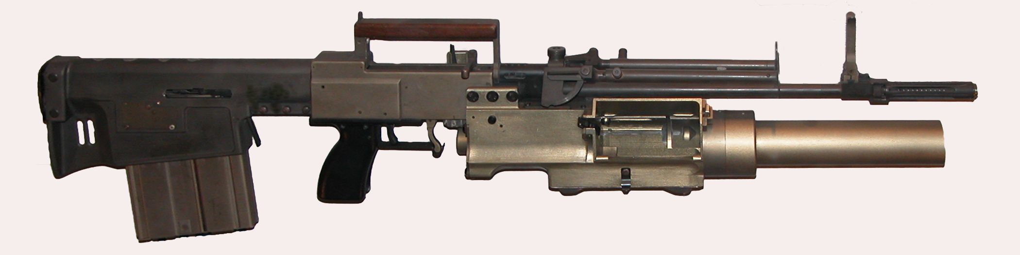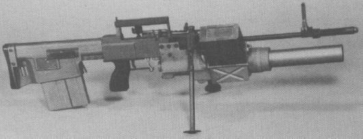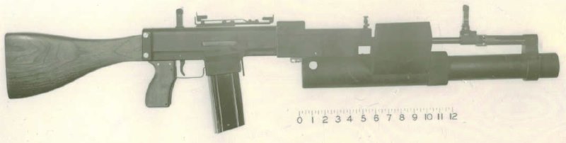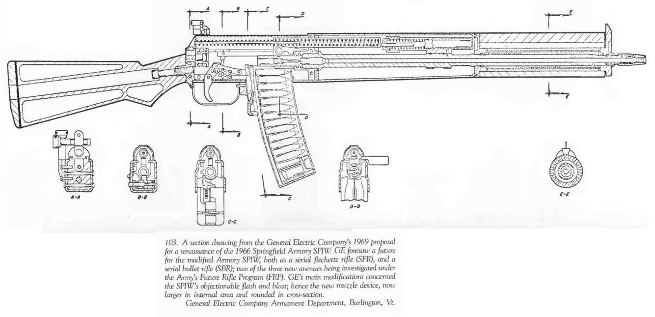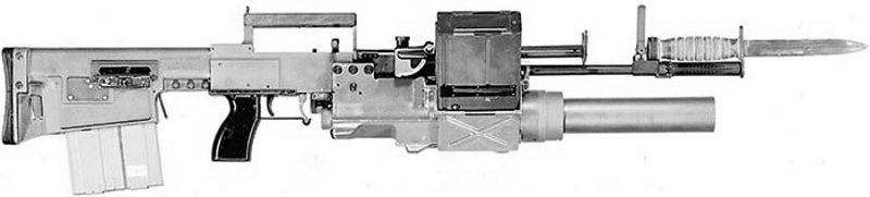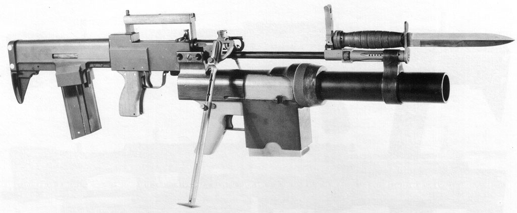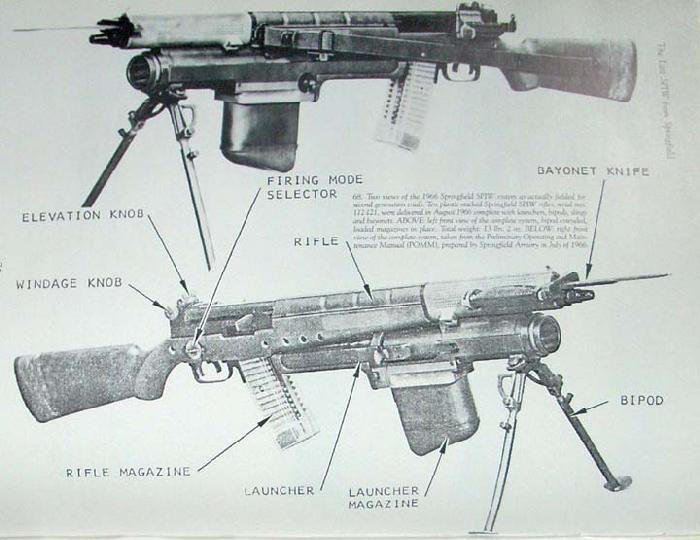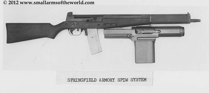 1966年重新设计第二代SPIW原型枪,两组30发弹匣改为左右排列,榴弹发射器改进自温彻斯特的设计