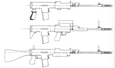 1963年研制的模块化结构原型枪,图左是传统布局,图右是无托布局