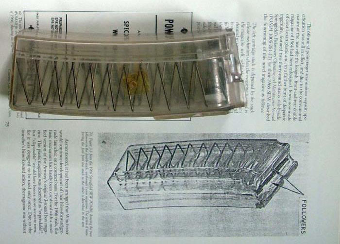在这一组弹匣插入到位后,左侧弹匣内的枪弹被往下压一些,先从右侧弹匣供弹。当右侧弹匣打空后,托弹板带动一个装置释放左侧弹匣内的枪弹,使其上升到可供弹的高度。另外,新的弹匣体材料改为透明聚碳酸酯塑料构成,方便射手观察余弹量,同时也能大幅度减轻重量。这种创新也是春田兵工厂的工程师在绝望中爆发的创造力,希望通过一些创新的特征来加分,以抵消固有缺陷方面的失分。