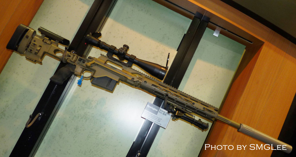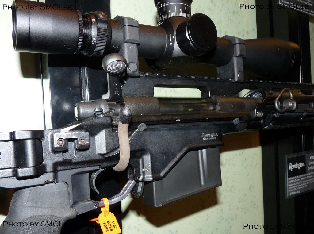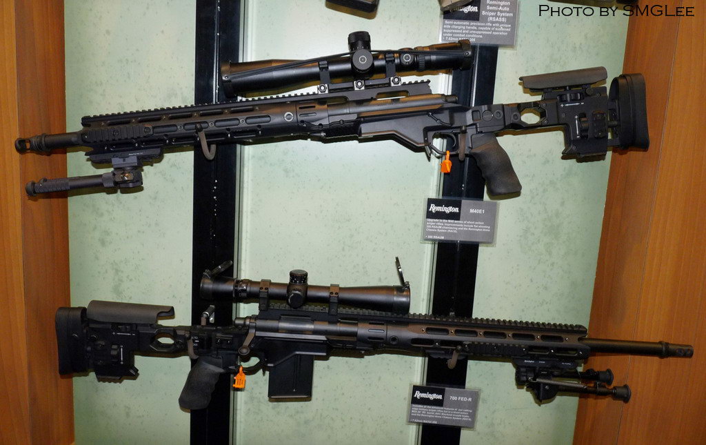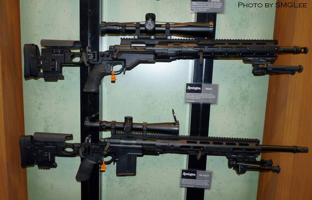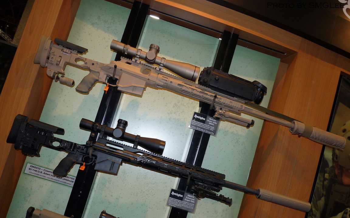 在SHOT SHOW 2011上的雷明顿MSR(上)和XM2010(下),可以从机匣形状上看出区别来