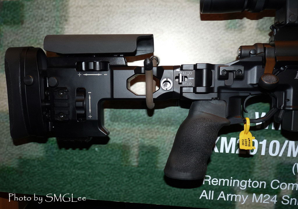 原本的HS公司的石墨纤维枪托改成雷明顿MSR的铝合金枪托,因此枪托的贴腮板高度、托底板长度可调,枪托在不使用时可向右折叠,以缩短携行长度,便于运输或隐蔽的潜行,前托有可拆卸的MIL-STD-1913皮卡汀尼导轨,便于安装各种附件。包裹枪管的管状前托比起原来的M24枪托还有一个优点,就是可以减少枪管发热产生的上升空气导致瞄准镜图像产生的扭曲现象。