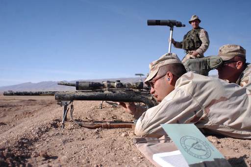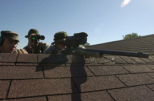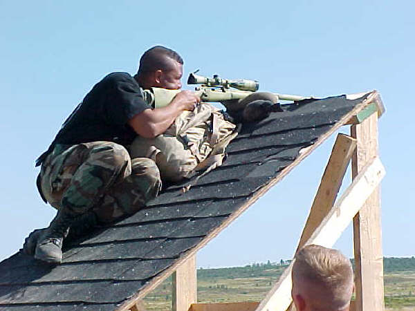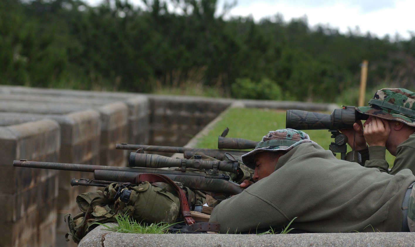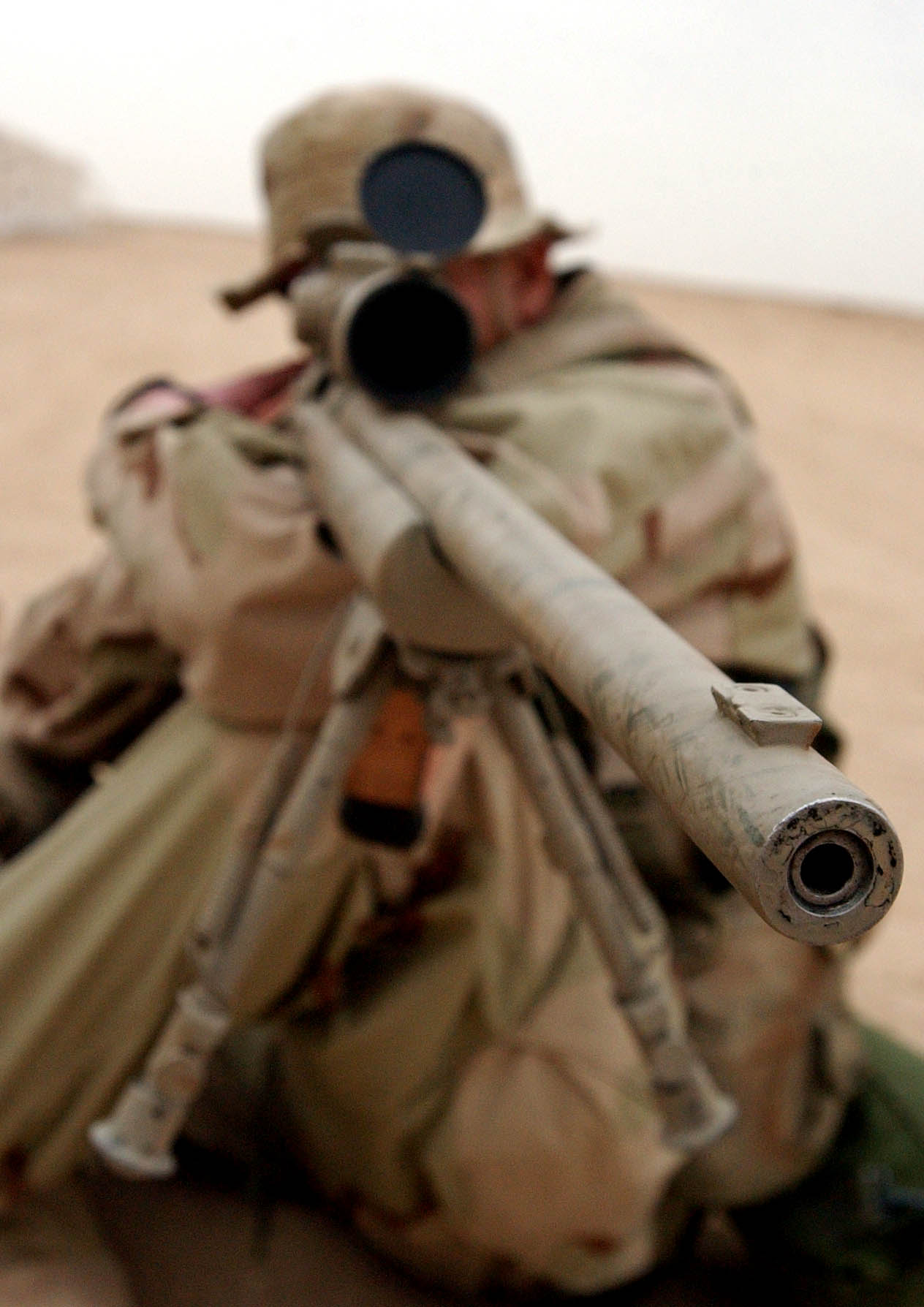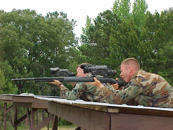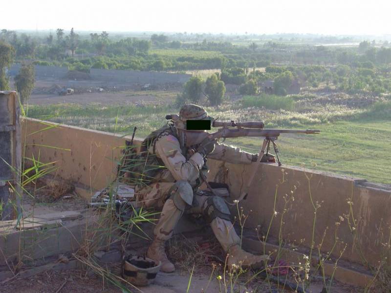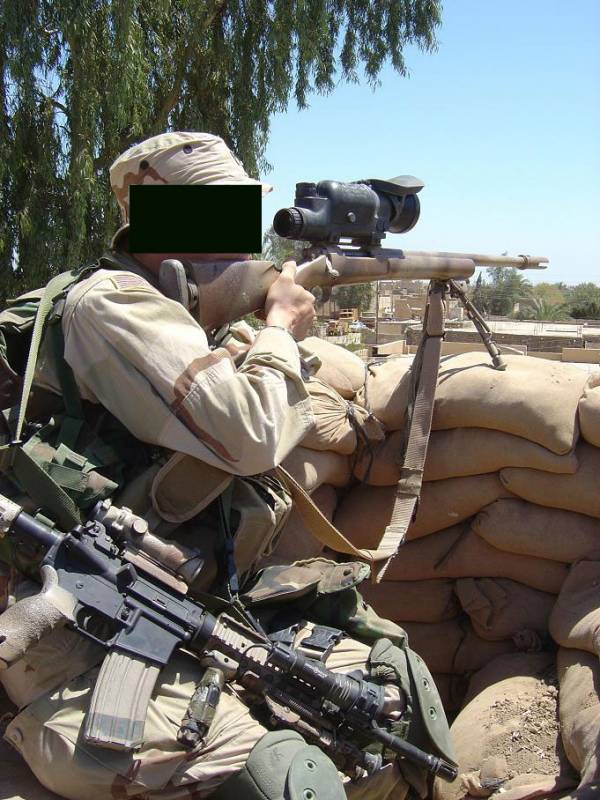 在伊拉克的陆军第二步兵师的一个狙击小组,M24的枪口安装了一种三叉形消焰器