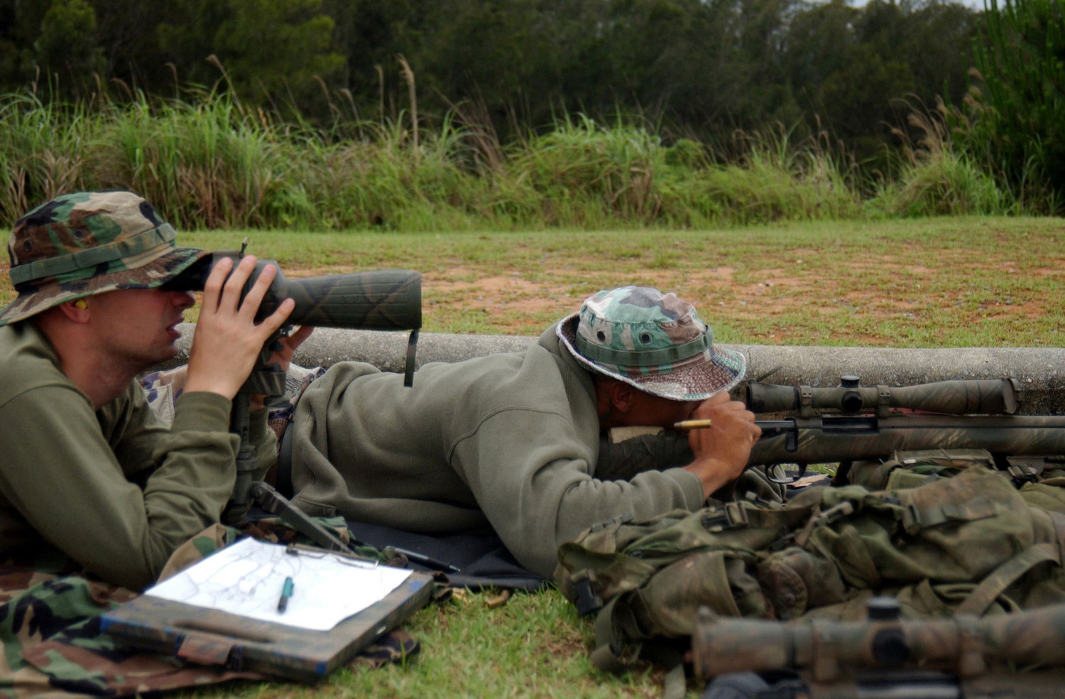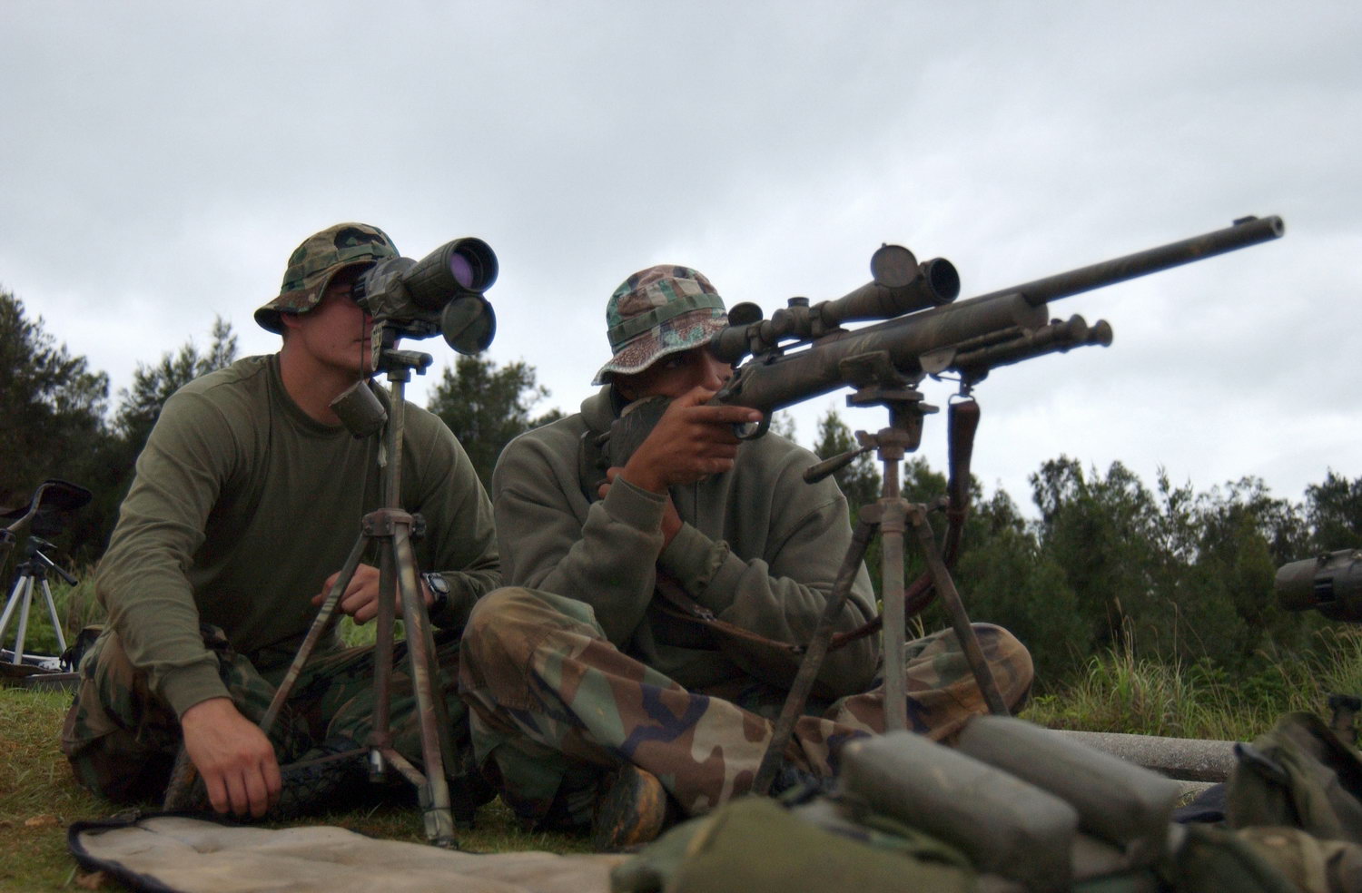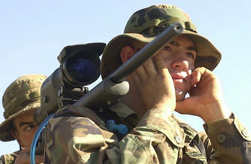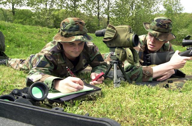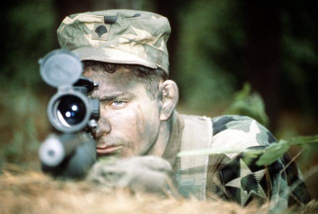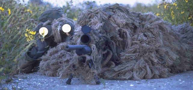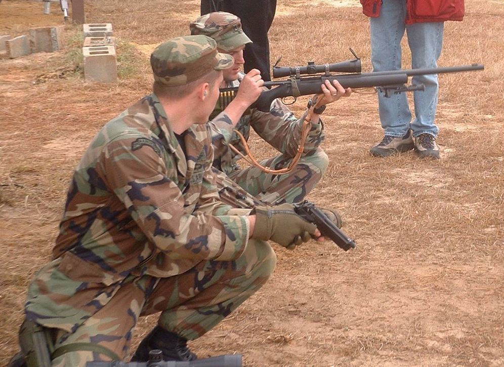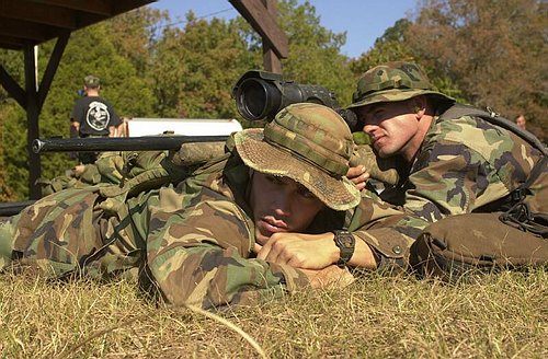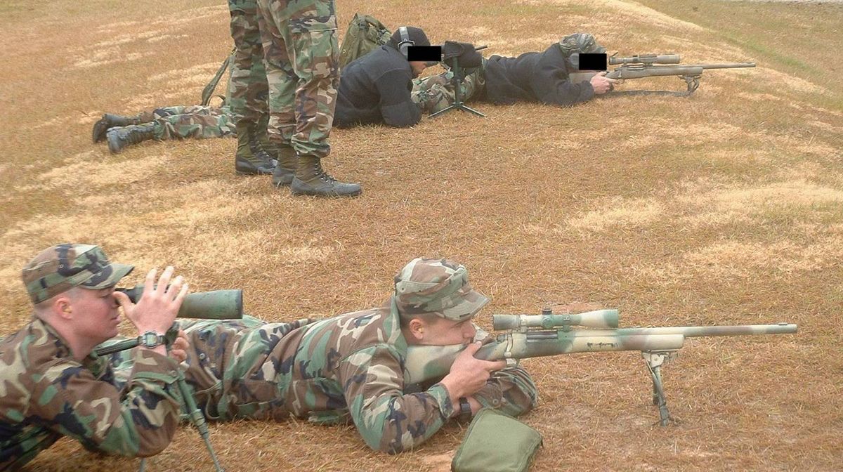 在伊拉克的陆军第二步兵师的一个狙击小组,M24的枪口安装了一种三叉形消焰器