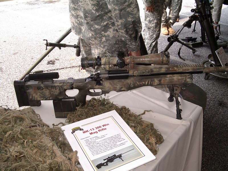 Mk13是由美国海军地面武器研制中心NSWC-CRANE为海军特种部队的狙击手研制和组织的中远距离狙击系统,该枪是采用雷明顿700 LA枪机和AICS枪托组合起来的中口径狙击步枪,口径为.300温彻斯特-马格南,枪管长26.5英寸,枪口可有快速拆卸的KAC消声器,机匣上有向前延伸的皮卡汀尼导轨用于安装瞄准镜及其他附件。由于是使用AICS枪托,如果不仔细辨识机匣和枪机部分的话,很容易会误认为是AWM。