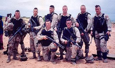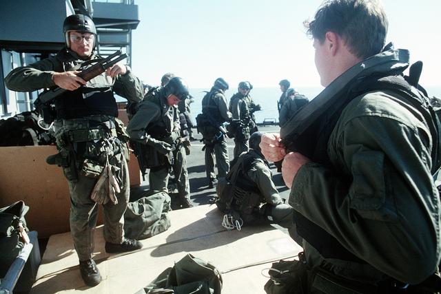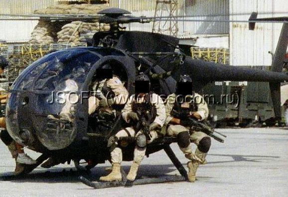 ![]() 1993年在哥特蛇行动中乘坐MH-6的三角洲队员,图中可见挂在RO727下面的“万能钥匙” |