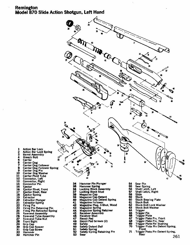雷明顿870是一种手动装填的霰弹枪,通过推拉泵动手柄(前托)进行抛壳、供弹。枪机为卡铁摆动式闭锁,通过闭锁卡铁进入枪管后上方的延长段的闭锁槽中闭锁,内置式击锤击发。装填弹药是通过机匣底部的装弹口装入,装弹口平时被托弹片挡住。向弹仓装弹时,向上顶开托弹片,将霰弹装入弹仓中。向后拉动枪机时,弹仓中的最后一发弹向后进入托弹片中并被托弹片上抬至进弹位置,再向前推动枪机时再将枪弹推进弹膛中。而弹壳从机匣右侧的抛壳口排出(从1971年开始生产专门的左手型,即抛壳口改在机匣左侧,不过数量不多)。