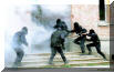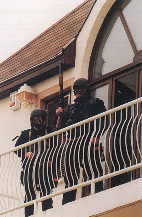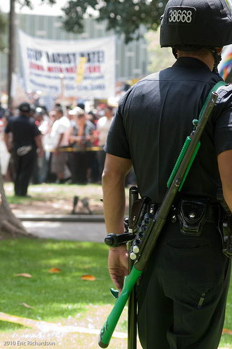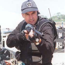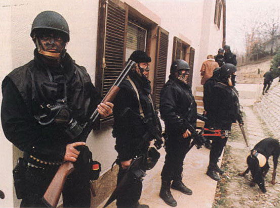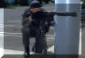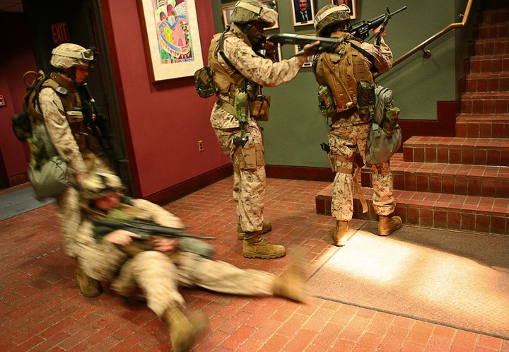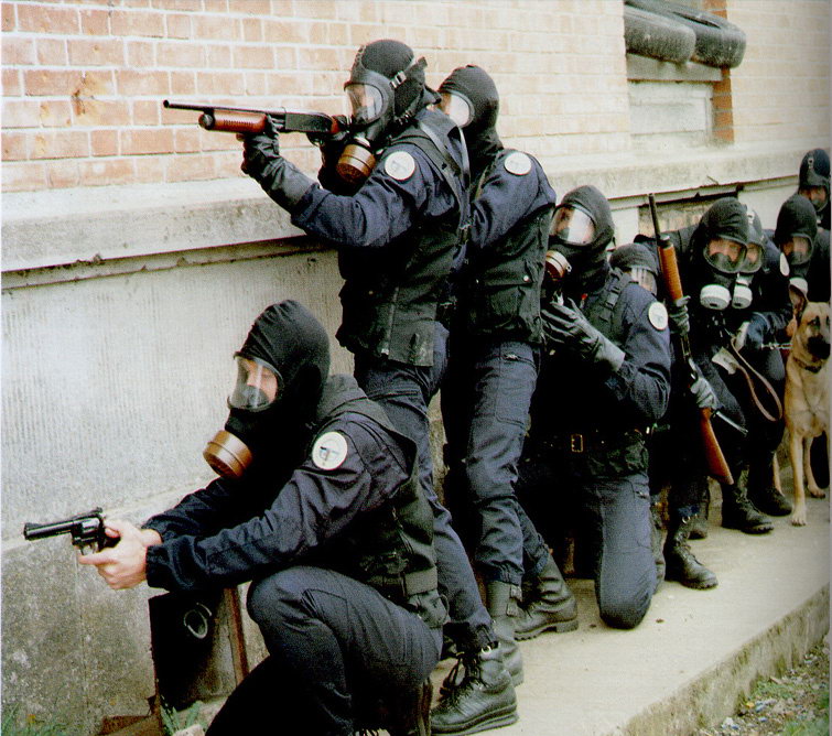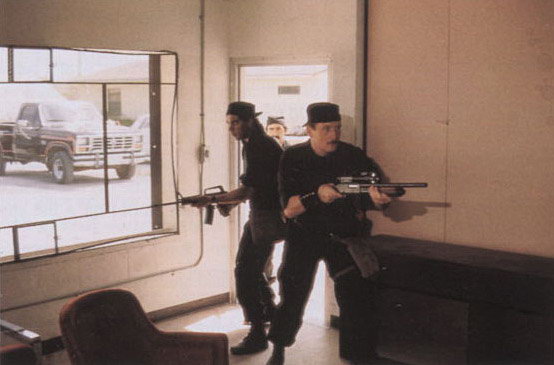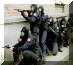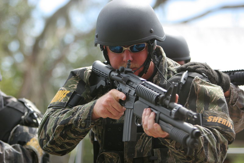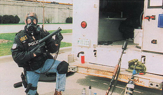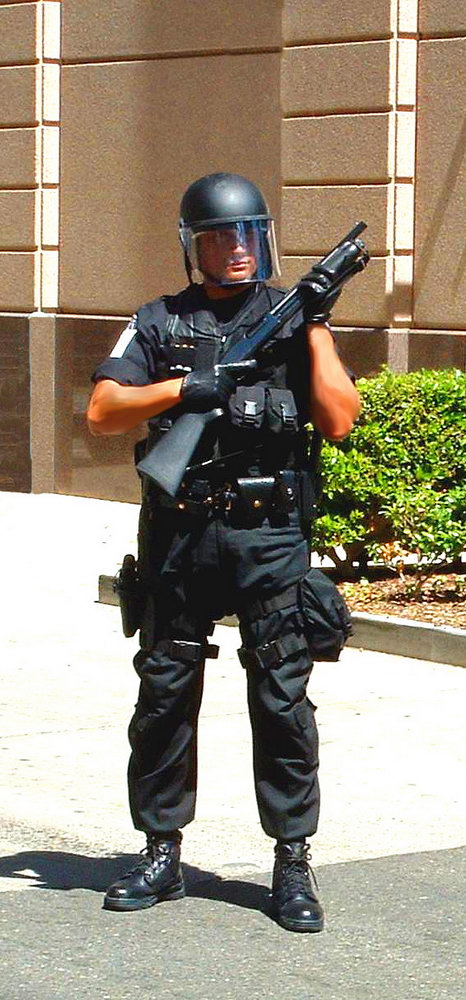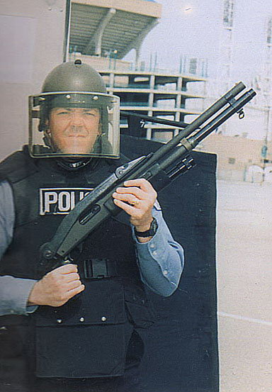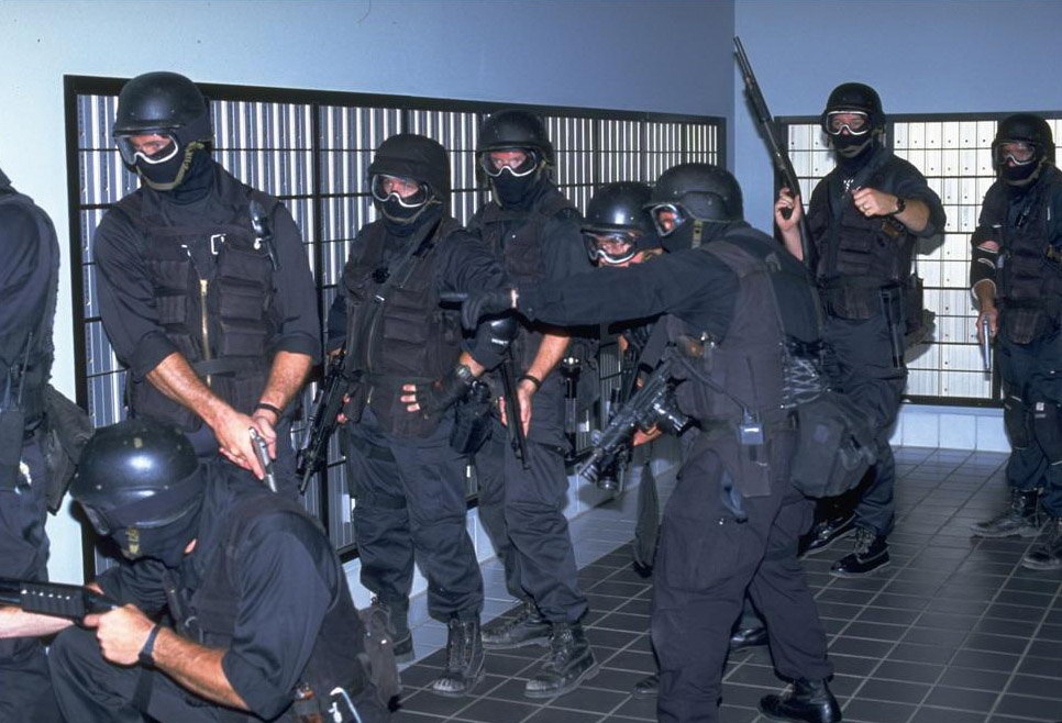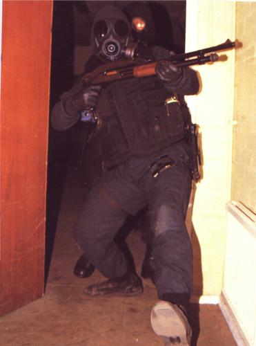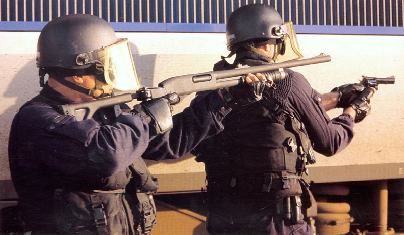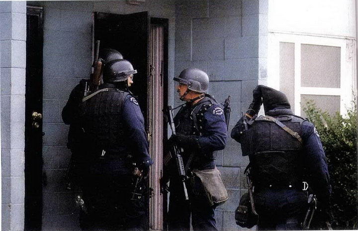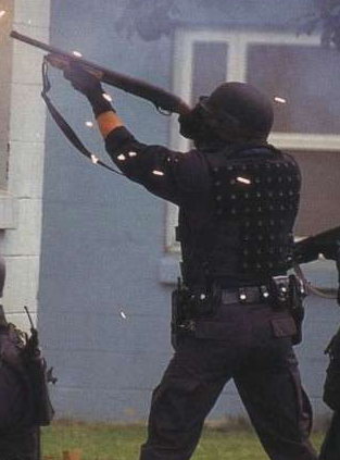 使用雷明顿870向藏有嫌疑犯的屋子内发射星光弹(相当于12号口径缩小版的闪光震憾弹)的洛杉矶特警察(LAPD SWAT)