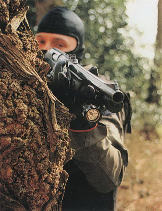 在还不流行SURE-FIRE战术灯的年代,把大号的手电筒夹在机匣顶部的SWAT