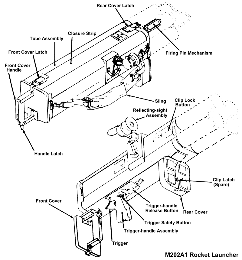 M202A1是一种可多次使用的肩射、轻型、四联装发射器,它由发射筒、护壳、前后护盖、发射机构、击发机构、瞄准具、握把和背带等组成。发射筒的结构与M72系列基本相同,仍为内外筒式结构,前筒用玻璃钢材料制成,后筒为铝制品。四个发射筒固定在框架上,用护带缠绕,构成整体护壳。前护盖用于保护发射器口部,与护壳的前隔框底部铰接,携行时用固定闩将前护盖锁在闭合位置。当前护盖打开并锁定在下面时,可以起前支架作用,发射时用来稳定发射器。后护盖与护壳的后隔框底部铰接,携行时以固定闩将后护盖锁在后端闭合位置,打开后可作为肩托。内筒拉出之后,靠闭锁钮锁定在发射位置。发射后可以重新装弹。