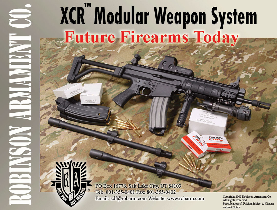 罗宾逊公司的XCR模块式武器系统是SCAR计划的另一种参选型。“XCR”是什么缩写呢?在罗宾逊公司的官方网站上也没有唯一答案,网站上只是说,可以是表示“可交换口径步枪”(eXchangeable Caliber Rifle),或“很棒的步枪”(eXtremely Cool Rifle),或“极品战斗步枪”(eXraordinary Combat Rifle),又或者是“必胜的战斗可靠性”(X-treme Combat Reliability)或“必胜战斗步枪”(X-treme Combat Rifle)。