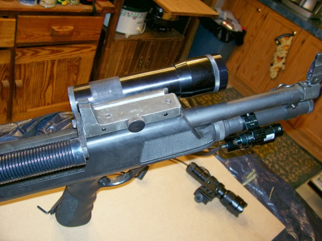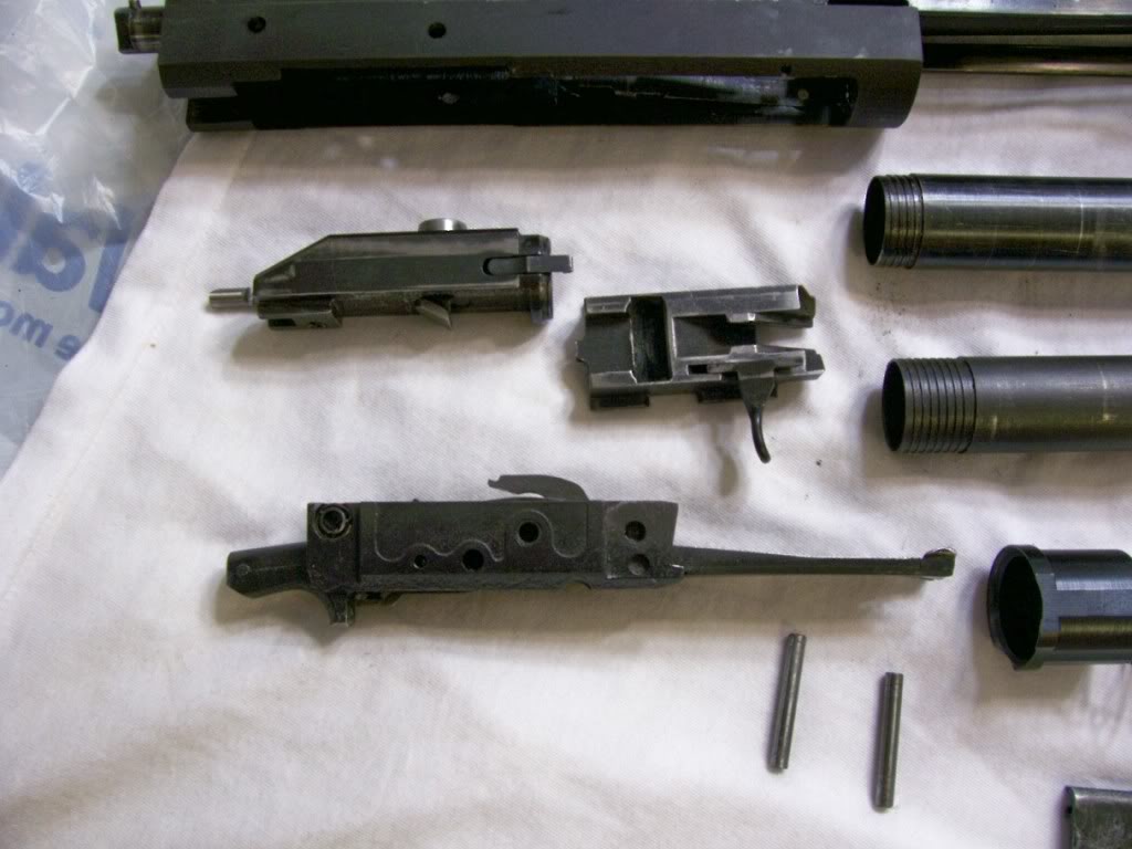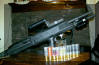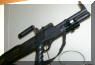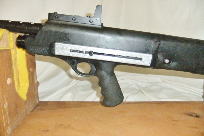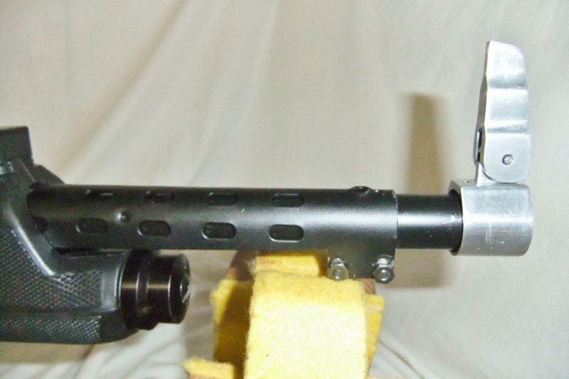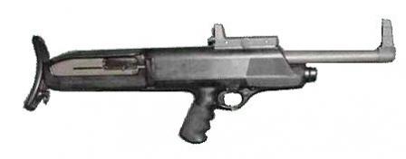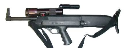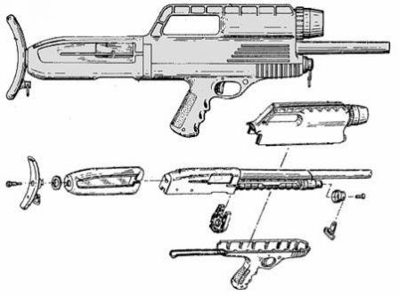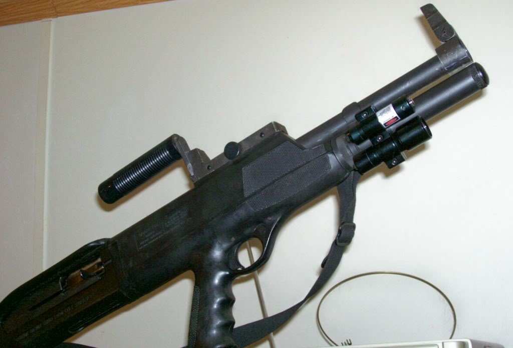 这个“装置”就是把原来的雷明登11-48去掉枪托,用一个手工制作的铝合金无托枪托包起来,握把和扳机移到前面,通过长长的扳机连杆与击发机构相连,枪托的托底板还可以旋转。