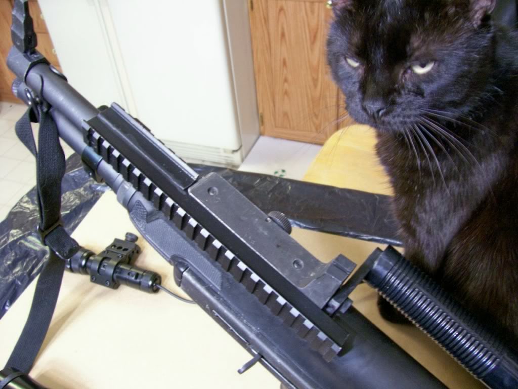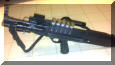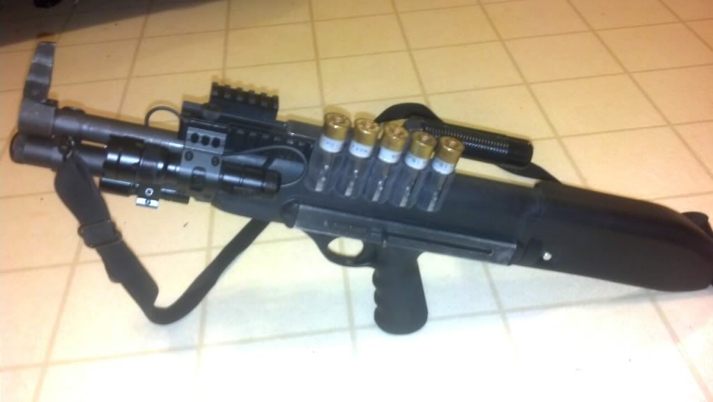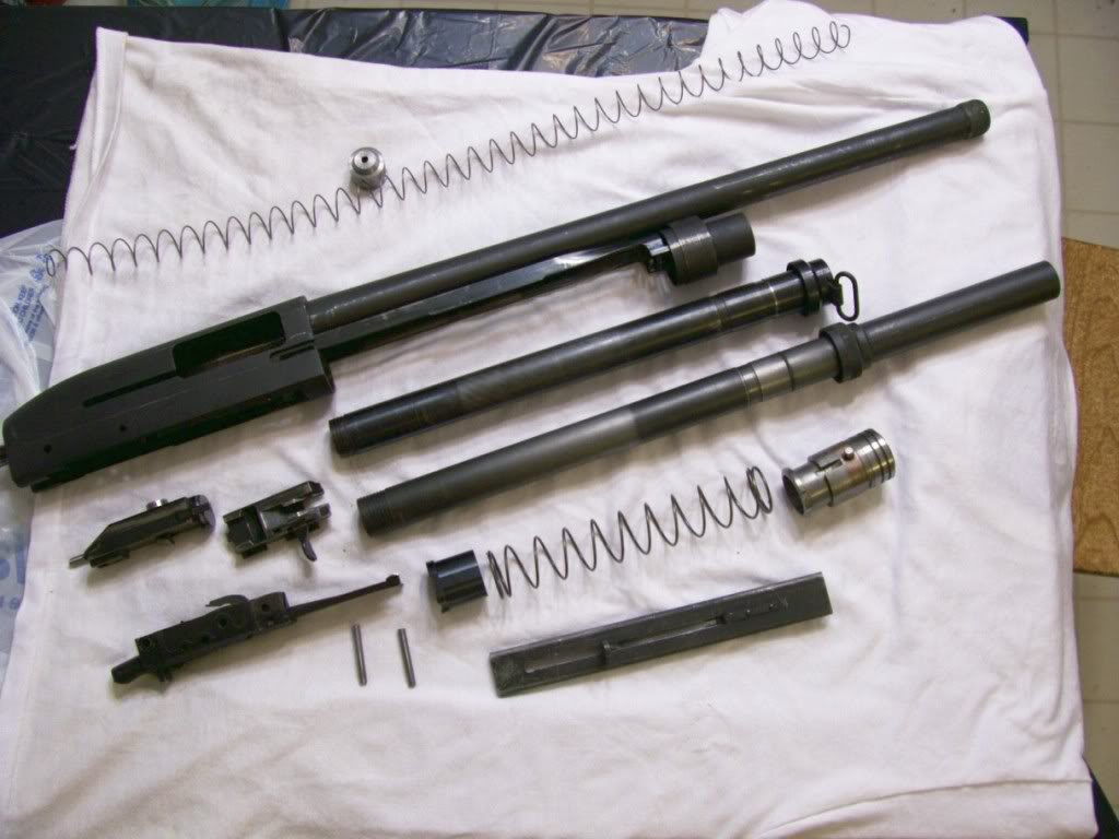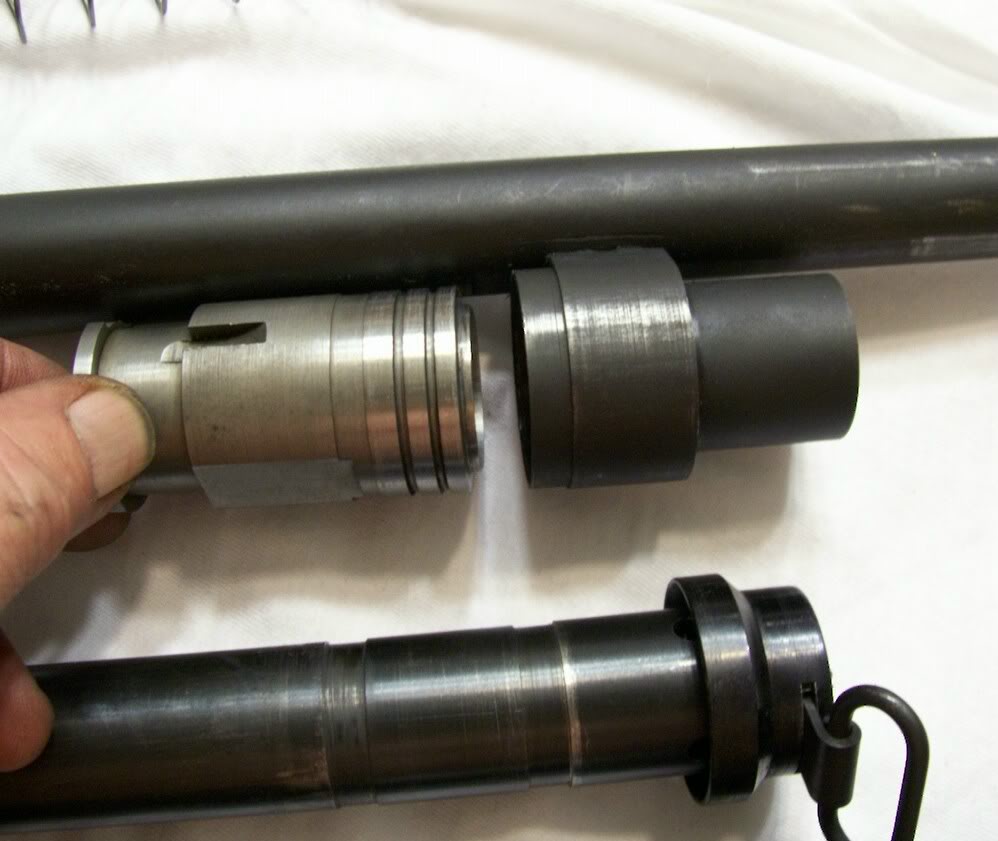 这个“装置”就是把原来的雷明登11-48去掉枪托,用一个手工制作的铝合金无托枪托包起来,握把和扳机移到前面,通过长长的扳机连杆与击发机构相连,枪托的托底板还可以旋转。