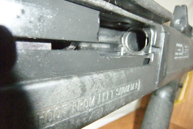 高标10B型的抛壳口,及抛壳口下方的警告“注意—不要使用左手射击”