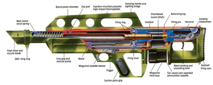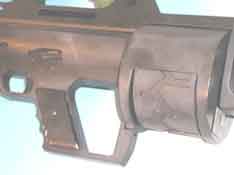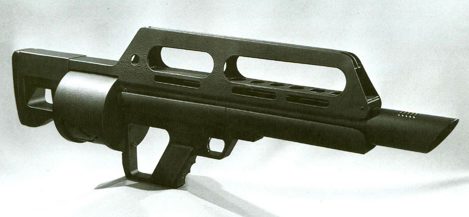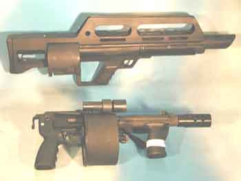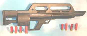 另外,这个转轮式弹匣预装的弹药有两种形式,第一种普通的12号70mm霰弹,另一种是像早期的转轮手枪一样,把发射药、底火和弹丸直接封装在弹膛里,再用塑料薄膜密封好,并在转轮上涂上不同的颜色标记以区分弹种。在把弹匣装到枪上前,必须先拆开塑料薄膜。发射完后,要把这个转轮送回工厂才能重新装填弹药。(如果使用普通12号霰弹时,可以携带散装的弹药作为备用,但装填时仍然需要把整个转轮卸出来,再抽出弹壳、装入新弹)