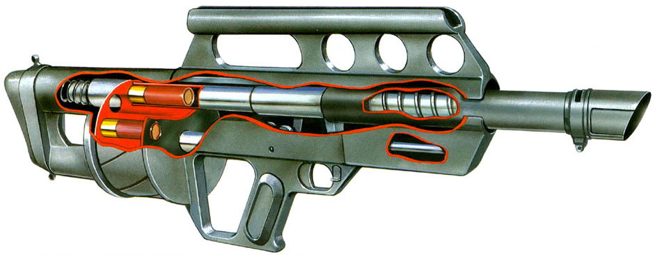 如上图所示,该枪的导气活塞是一个固定在枪管中部外面的圆环(82号),位于导气孔(86号)的前面。复进簧(32号)也绕在枪管外面,在导气活塞前方。枪管本身可以浮动,枪管外筒(机匣)与枪管之间形成导气室。