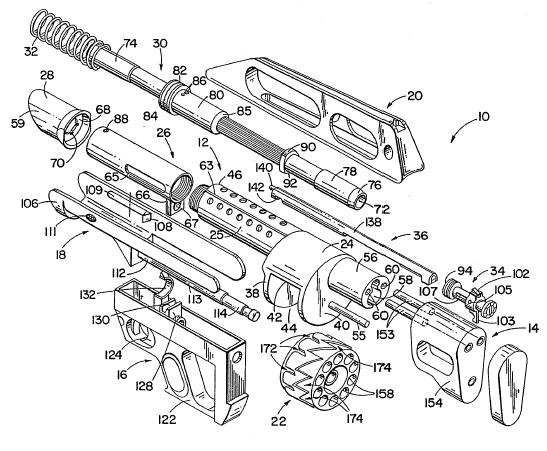发射时,火药燃气通过导气孔进入导气室,推动导气活塞带动整根枪管克服复进簧的压力向前移动。枪管向前移动时,首先与发射后的弹膛分离,然后继续向前移动,带动连接着枪管的驱动杆(138号)也向前移动。驱动杆尾部的柱销扣与转轮式弹匣(22号)外表面的刻槽(174号)相啮合,因为此时驱动杆柱销是啮合在转轮表面刻槽的斜向部分中,因此也就带动着转轮旋转。枪管前驱到位后,转轮中的下一发弹膛转动到12点钟位置,正好对准了枪管位置。枪管在复进簧的作用下开始向后移动,此时驱动杆柱销也对准了转轮刻槽中的纵向部分,因此驱动杆的向后运动并不会驱动转轮转动。当枪管复进到位后,枪管尾端进入转轮中12点钟位置的弹膛前端内,实现气密连接,这样在发射时就不会像传统转轮手枪那样在弹膛与枪管之间泄出火药气体。如果此时仍然扣着扳机,则会击发下一发弹。该枪没有快慢机,只能全自动射击,不过由于该枪的射速非常低,完全可以通过扳机控制来实现单发。