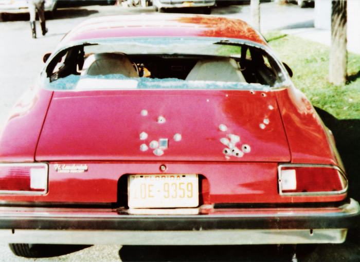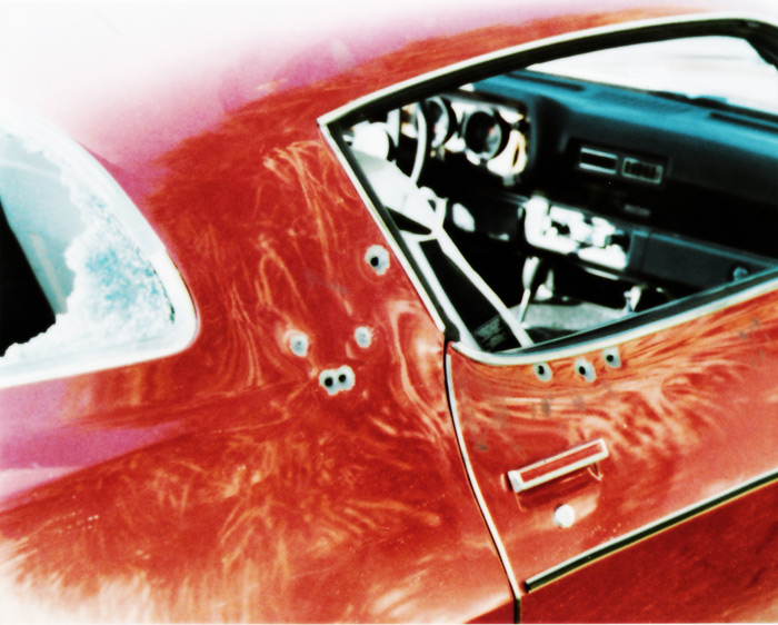 被击中的雪佛兰卡魅罗1974版跑车,后窗玻璃被多发子弹击碎。这款车型是《变形金刚》真人版大黄蜂出场时的造型